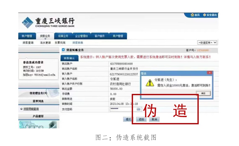 近日,有不法分子冒充我行工作人员以帮助客户申请贷款为由实施诈骗。其主要手段为:不法分子通过短信或电话联系有资金需求的客户让客户添加其微信,声称是我行员工并出示伪造的工作证件(如图一),通过提供伪造的内部系统截图(如图二),骗取客户信任,称存入少量资金即可获取贷款。此为诈骗,请切勿相信!
